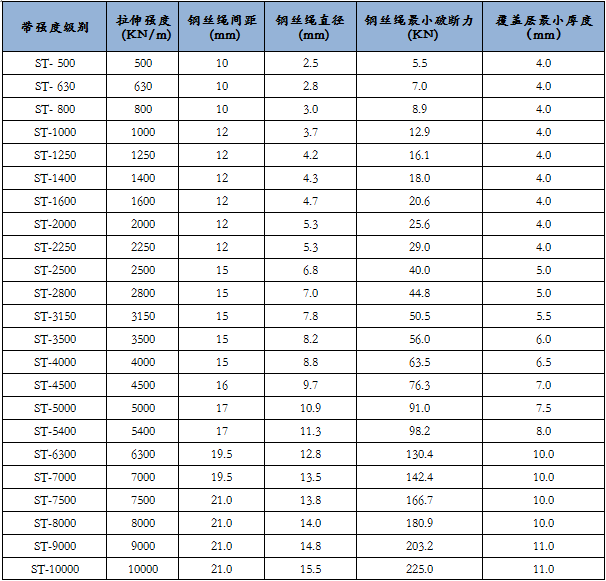 1 、抗拉強(qiáng)度高:適用于單機(jī)大跨度、長距離輸送物料。