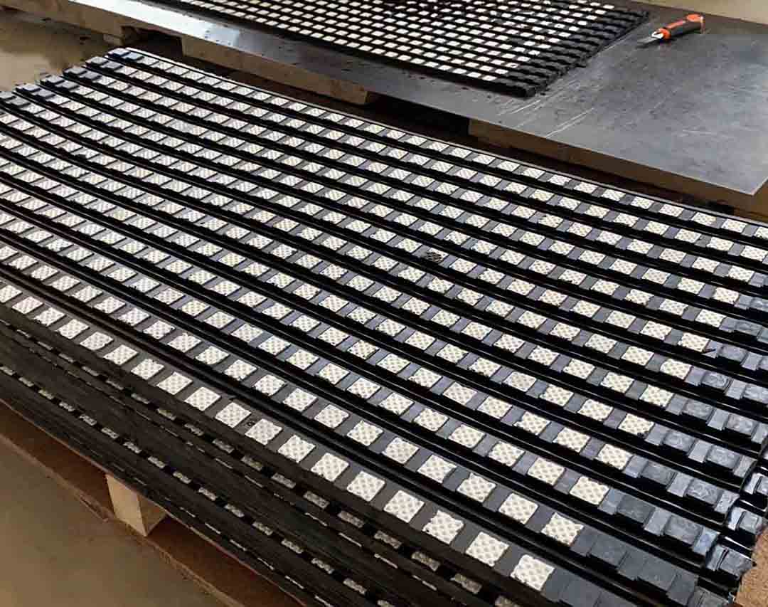 5.防脫落:陶瓷橡膠鋼板一體硫化,結合非常牢固;每塊陶瓷都有穿透式螺栓穿過底部鋼